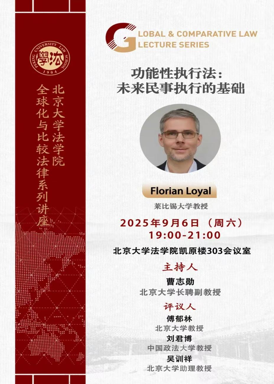 讲座回顾 || Florian Loyal:功能性执行法:未来民事执行的基础2025年9月6日,德国莱比锡大学Florian Loyal教授在北京大学法学院凯原楼303会议室作题为“功能性执行法:未来民事执行的基础”的学术讲座。本次讲座由北京大学长聘副教授曹志勋主持,北京大学教授傅郁林、中国政法大学教授刘君博和北京大学助理教授吴训祥担任评议人。讲...082026 01月 -