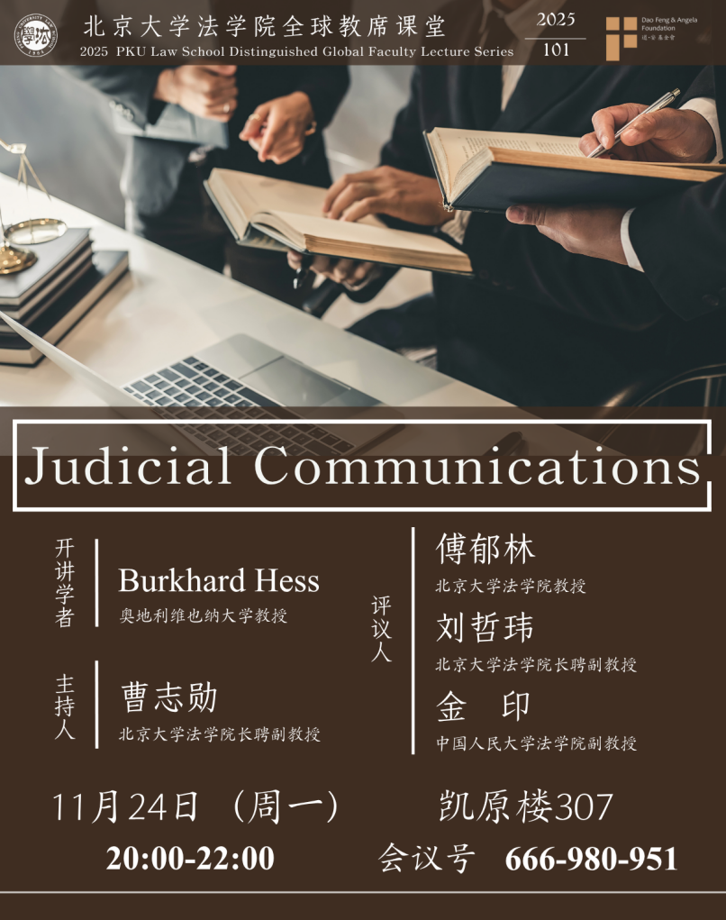 讲座回顾 || Burkhard Hess ——《司法沟通(Judicial Communications)》2025年11月24日晚,北京大学法学院全球教席学者、奥地利维也纳大学Burkhard Hess教授以“司法沟通(Judicial Communications)”为题开展讲座。本次讲座由北京大学法学院长聘副教授曹志勋主持,北京大学法学院教授傅郁林和中国人民大学法学院副教授金印担任评议...052025 12月 -